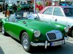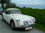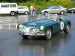 Als MG A 1500 wurde dieses Roadster-Modell ab 1955 angeboten. Zwischen 1958 und 1960 hatte  M orris G arages  dann auch den besonders sportlichen MG A Twin Cam im Angebot. Wie dem Modellnamen zu entnehmen ist, war der Motor mittels zweier oben liegenden Nockenwellen leistungsgesteigert. Der temperamentvolle Motor war während seiner gesamten Produktionszeit bekannt für häufig auftretenden Motorschäden die auf Garantie behoben werden mussten. Durch diese Rufschädigung waren die Verkaufszahlen des Modelles nicht sonderlich hoch. Der Vierzylinderreihenmotor hat einen Hubraum von 1588 cm§ und leistet rund 108 PS. Ein solcher Roadster war im Jahr 1958 auf dem deutschen Markt ab DM 11.750,00 zu bekommen. Insgesamt setzte MG während der dreijährigen Produktionszeit 1788 Roadster und 323 geschlossene Coupes dieses Typs ab. Classic car meeting in Brynmawr/South Wales am 27.07.2025.