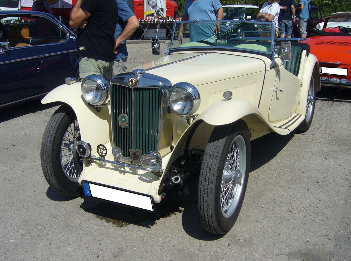 MG TC. 1945 - 1950. Der TC war das erste Nachkriegsmodell von Morris Garage und basierte auf den Vorkriegstypen TA und TB. Der 4-Zylinderreihenmotor leistet aus 1.250 cm³ Hubraum ca. 54 PS. Ein solches Modell kostete ca. 530 britische Pfund und verkaufte sich über 10.000 mal. Obernai im Elsaß am 22.06.2012.