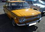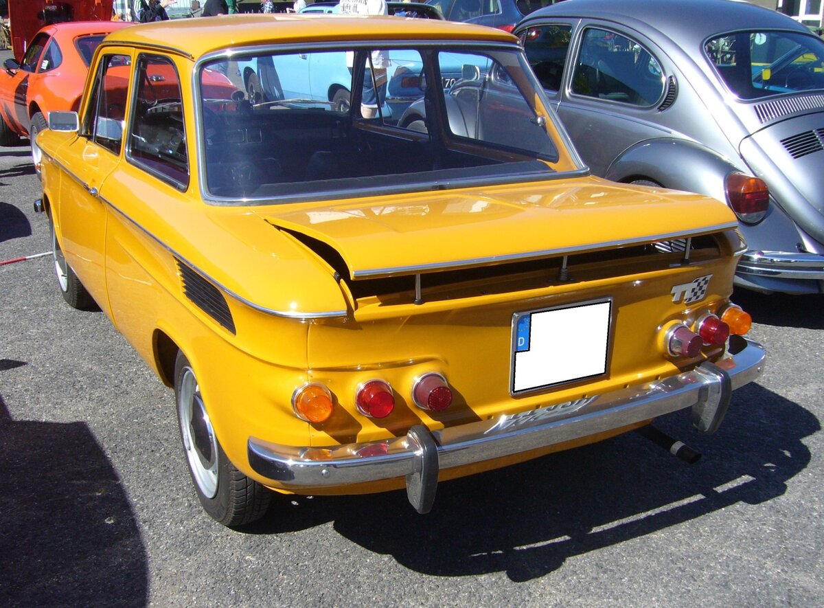 NSU 1200 TT, gebaut in Neckarsulm von 1968 bis 1972. Von diesem sportlichen Gebrauchswagen wurden insgesamt 64.269 Einheiten produziert. Davon 14.942 mit dem 1.0l Motor und 49.327 mit dem 1.2l Motor. Der abgelichtete TT in einem perlmutt Farbton hat serienmäßig einen Vierzylinderreihenmotor mit einem Hubraum von 1177 cm³ und einer Leistung von 65 PS. Wobei ich glaube, das dieser TT technisch verbessert wurde. Oldtimertreffen am Theater an der Niebu(h)rg am 19.10.2025 in Oberhausen/Rheinland.
