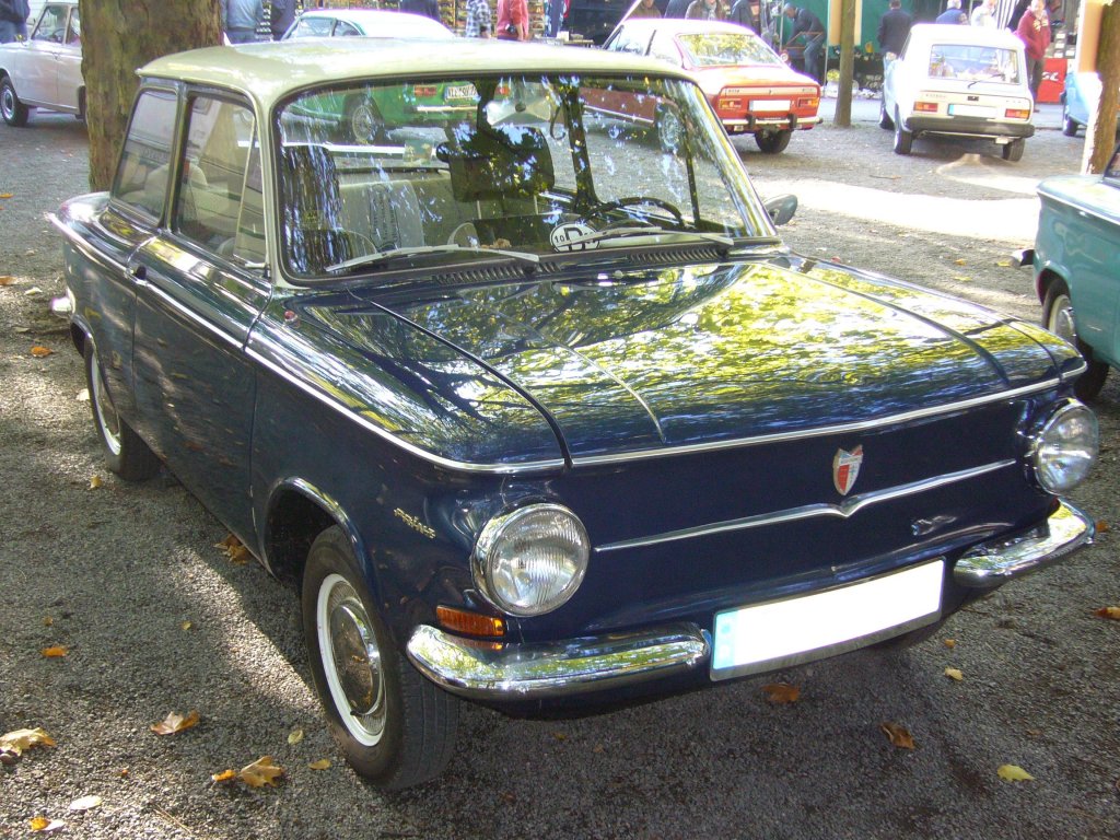 NSU Prinz 4. 1961 - 1973. Der Prinz 4 war ein kleines "Raumwunder". Der im Heck verbaute 2-Zylindervertikaltwin leistet 30 PS aus 598 cm³ Hubraum. Hier wurde ein Modell der ersten Serie (bis 1969) abgelichtet. Erkennbar an der schmaleren Zierleiste auf der Frontmaske. Der Prinz 4 war besonders in Italien ein Verkaufsschlager. Historicar am 15.10.2011.