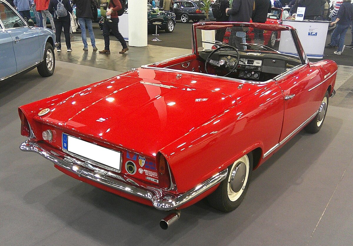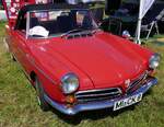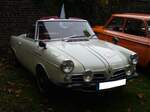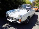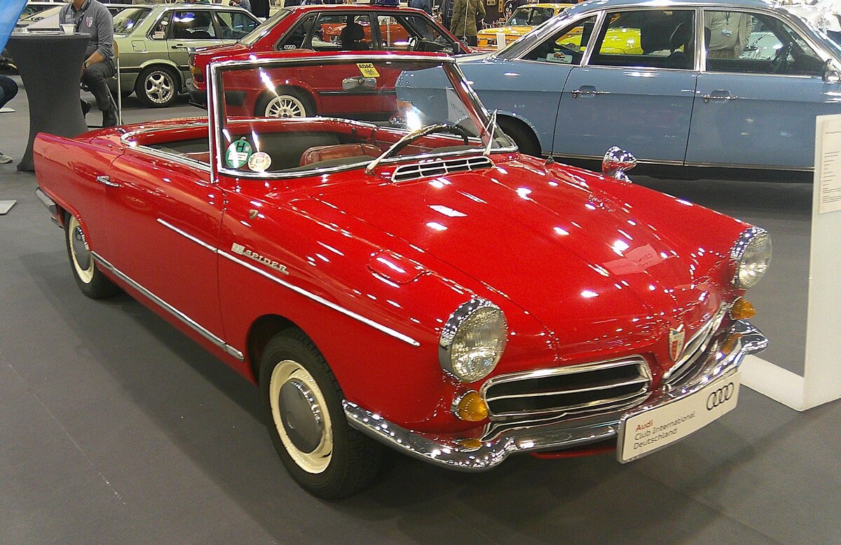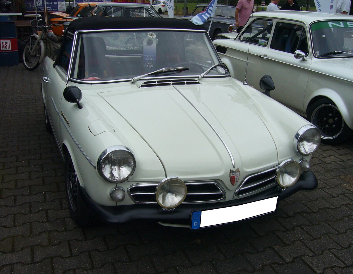 NSU Wankelspider aus dem Jahr 1966 im Farbton gletscherweiß. Der NSU Wankel Spider wurde von 1964 bis 1967 produziert und war das erste Serienauto der Welt mit einem Wankelmotor. Das Modell wurde auf der Frankfurter Automobilausstellung im September 1963 vorgestellt. Während der vierjährigen Produktionszeit wurden 2375 Wagen hergestellt. Der im Fahrzeugheck verbaute Einkammer-Wankelmotor hat einen Kammerinhalt von 500 cm³ und leistet 50 PS. Die Höchstgeschwindigkeit liegt bei 152 km/h. Treffen 150 Jahre NSU am 30.07.2023 in Duisburg-Großenbaum.