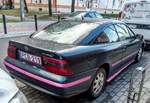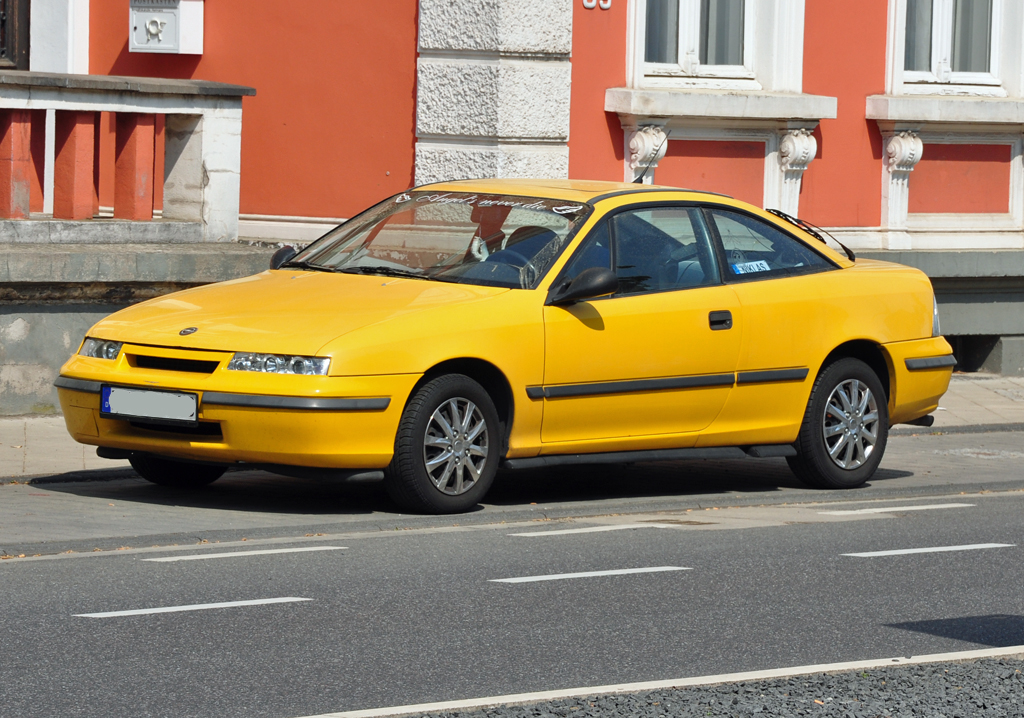Opel Calibra im Farbton karibikblau. Auf der Basis des im Herbst 1988 eingeführten Opel Vectra A platzierten die Rüsselsheimer ab September 1989 das Sport-Coupe Calibra. Der hier gezeigte Calibra ist vor dem Sommer 1994 produziert worden, da er das Opel-Logo noch auf der Motorhaube trägt. Standardmotorisierung, wie beim gezeigten Auto, war ein quer eingebauter Vierzylinderreihenmotor mit einem Hubraum von 1998 cm³ und einer Leistung von 115 PS. Die nächste Steigerungsstufe hatte den selben Motor, allerdings mit Sechszehnventiltechnik. Hier betrug die Leistung 150 PS bzw. 136 PS mit Katalysator. Wurde auf dem genannten Motor ein Turbolader verbaut waren es dann 204 PS. Krönung war der Calibra mit dem V6-Motor mit 2498 cm³ Hubraum und einer Leistung von 170 PS. Youngtimertreffen des AMC Duisburg am 21.09.2025. Michael H.