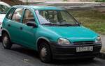 Opel Corsa B in Türkis. Die AUfnahme stammt von Mai, 2024.
