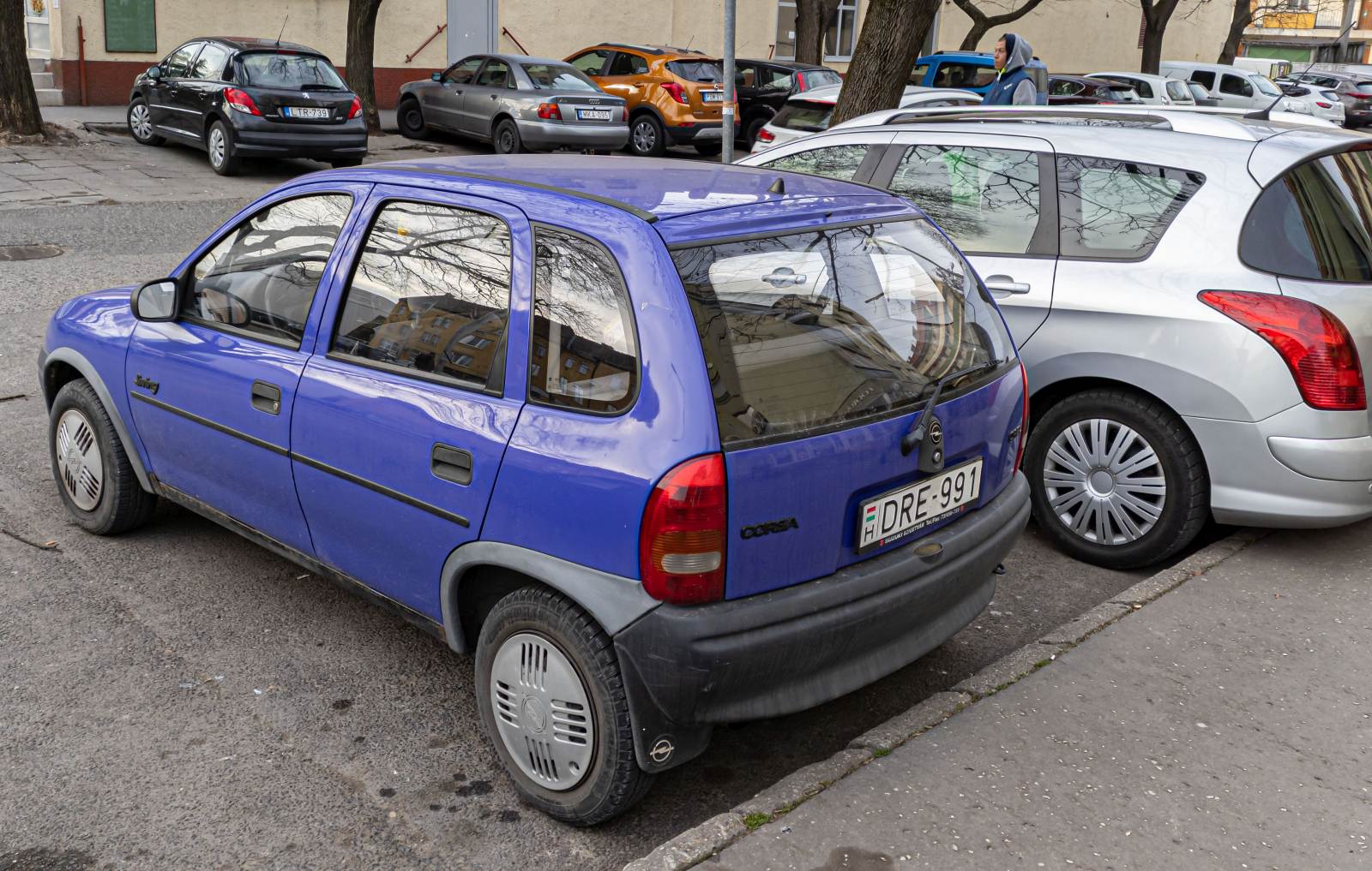 Rückanischt: violetter Opel Corsa B mit schönen Radkappen. Foto: 03.2022.