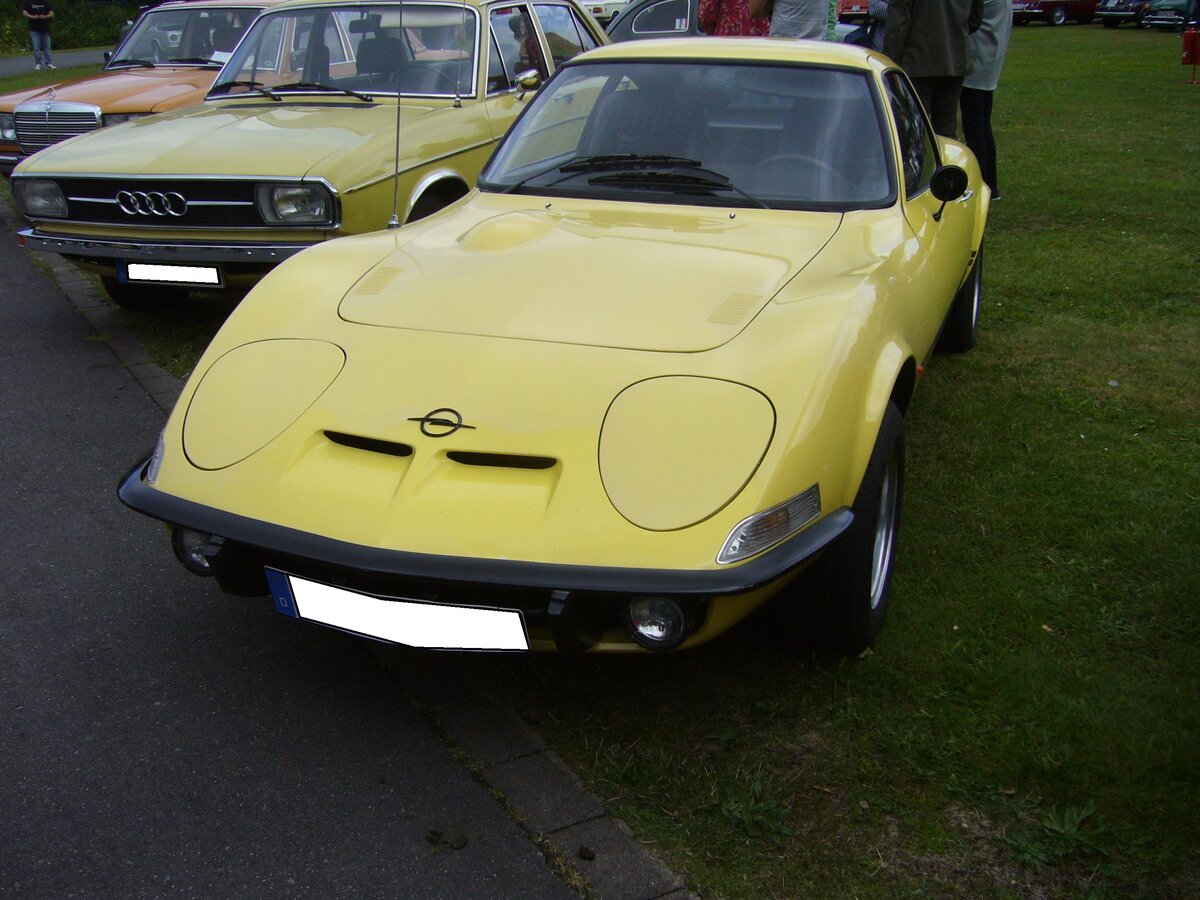 Opel GT/J, produziert in den Jahren von 1971 bis 1973. Der Opel GT stand ab August 1968 in den Verkaufsräumen der Opel Händler. Ab März 1971 ergänzte das GT/J Modell die Produktpalette. Bei diesem Modell waren, alle sonst verchromten Bauteile, mattschwarz eingefärbt. Diese Maßnahme sollte, das junge, sportlich ausgerichtete Kundenklientel ansprechen. Der GT/J war nur mit dem 1897 cm³ großen Vierzylinderreihenmotor mit 90 PS lieferbar. Oldtimertreffen an der Dreieckswiese in Duisburg am 01.08.2021.