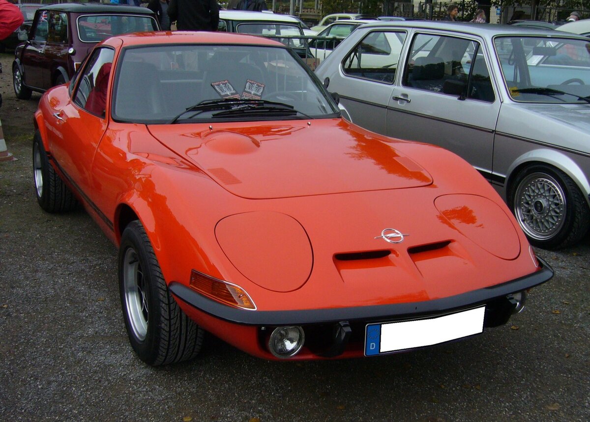 Opel GT/J aus dem Jahr 1973. Produziert wurde das Sportcoupe von 1968 bis 1973. Die Karosserie des GT wurde bei Brissoneaux & Lotz in Nantes/Frankreich gefertigt und zur Endmontage nach Bochum geliefert. In den ersten drei Produktionsjahren konnte man den GT auch mit dem 1.1l Motor aus dem Kadett ordern. Da sich aber nur 3.573 Kunden für den schwachbrüstigen 1100´er entschieden, wurde er im Jahr 1970 aus dem Programm genommen. Ab diesem Zeitpunkt gab es nur noch den 90 PS starken Vierzylinderreihenmotor mit einem Hubraum von 1897 cm³. Ab März 1971 ergänzte das Modell GT/J die Produktpalette. Bei diesem Modell waren, alle sonst verchromten Bauteile, mattschwarz eingefärbt. Diese Maßnahme sollte insbesondere, das junge, sportlich ausgerichtete Kundenklientel ansprechen. Oldtimertreffen am Theater an der Niebu(h)rg in Oberhausen am 23.10.2022.