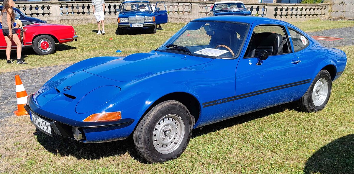 Opel GT/J aus dem Jahr 1973. Produziert wurde das Sportcoupe von 1968 bis 1973. Die Karosserie des GT wurde bei der Firma Brissoneaux & Lotz im französischen Nantes gefertigt und zur Endmontage nach Bochum geliefert. In den ersten drei Produktionsjahren konnte man den GT auch mit dem 1.1l Motor aus dem Kadett ordern. Da sich aber nur 3.573 Kunden für den schwachbrüstigen 1100´er entschieden, wurde er im Jahr 1970 aus dem Programm genommen. Ab diesem Zeitpunkt gab es nur noch den 90 PS starken Vierzylinderreihenmotor mit einem Hubraum von 1897 cm³. Ab März 1971 ergänzte das Modell GT/J die Produktpalette. Bei diesem Modell waren, alle sonst verchromten Bauteile, mattschwarz eingefärbt. Diese Maßnahme sollte insbesondere, das junge, sportlich ausgerichtete Kundenklientel ansprechen. Oldtimertreffen am Theater an der Niebu(h)rg am 19.10.2025 in Oberhausen/Rheinland.