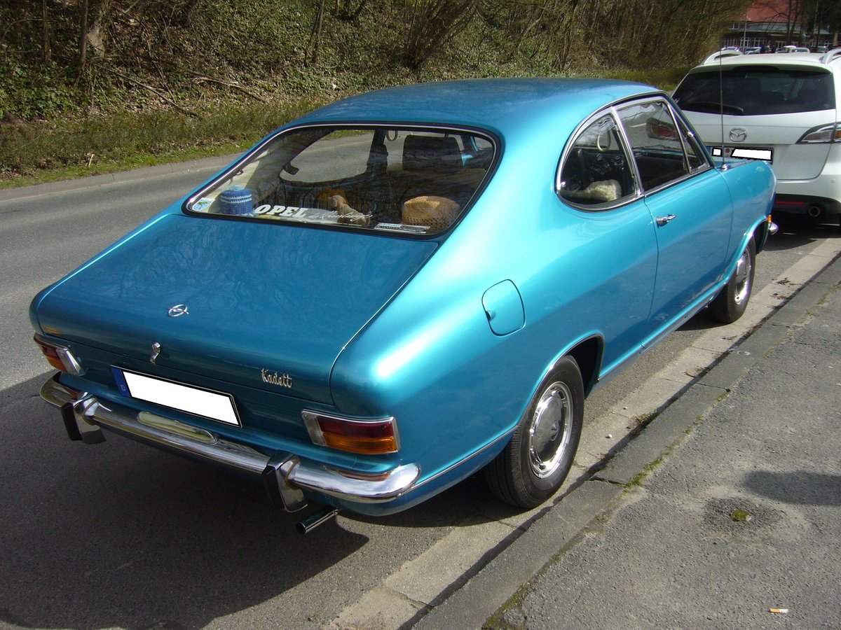 Heckansicht eines monzablauen Opel Kadett B LS Coupe. 1967 - 1971. Oldtimertreffen "Schwarzwaldhaus" Mettmann am 08.04.2018.