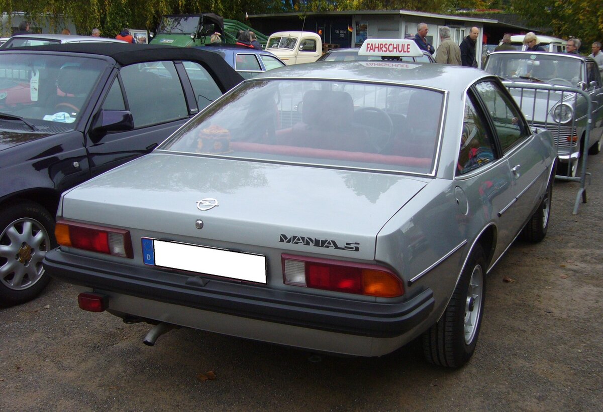 Heckansicht eines Opel Manta B der zweiten Serie im Farbton astrosilber. Produziert wurde der Manta B von 1975 bis 1988. Der Manta B wurde zeitgleich mit dem Ascona B vorgestellt, blieb aber aufgrund seiner Verkaufserfolge sieben Jahre länger im Programm. Das familientaugliche Sport-Coupe wurde 534.634 mal gebaut. Das Modell war in etlichen Motorisierungs- und Ausstattungsversionen lieferbar. Der hier gezeigte Manta B wurde im März 1981 erstmalig zugelassen. Es ist ein Modell mit der luxuriösen Berlinetta-Ausstattung mit dem so genannten 2.0S Motor. Dieser Vierzylinderreihenmotor hat einen Hubraum von 1979 cm³ und leistet genau 100 PS. Die Höchstgeschwindigkeit gab Opel damals mit 180 km/h an. Oldtimertreffen beim Theater an der Niebu(h)rg am 20.10.2024 in Oberhausen/Rhld.