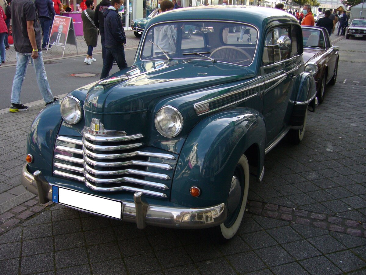Opel Olympia, wie er von 1950 bis 1953 in Rüsselsheim vom Band lief. Der Olympia war der erste Personenwagen, den Opel nach dem Krieg wieder produzierte. Von 1947 bis 1950 glich er dem Vorkriegs-Olympia. Danach erfolgte das ein "Facelift". Der abgelichtete Olympia wurde 1952 produziert. Der Vierzylinderreihenmotor leistet 39 PS aus einem Hubraum von 1488 cm³. Oldtimertreffen in Heiligenhaus am 12.09.2021.