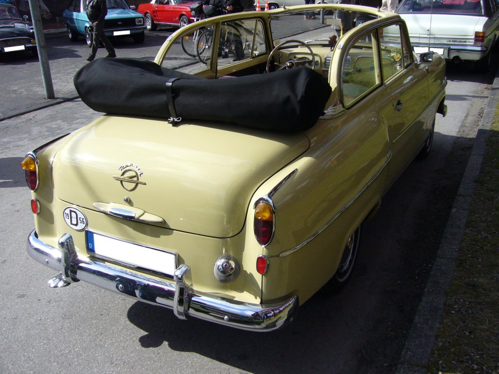 Opel Olympia Rekord Cabriolet-Limousine. 1953 - 1956. Der Olympia Rekord wurde bis 1957 produziert. Als Facelift prangte in jedem Modelljahr ein neuer Kühlergrill an der Front des Wagens. Lediglich im letzten Produktionsjahr wurde die Cabriolet-Limousine eingestellt. Das abgelichtete Auto stammt aus dem Jahr 1956 und ist im Farbton 400/Saharagelb lackiert. Der 1.488 cm³ große 4-Zylinderreihenmotor leistet 45 PS. Ein solche Cabriolet-Limousine schlug 1956 mit DM 6.560,00 zu Buche. Für die normale Limousine verlangte der Opel Händler DM 410,00 weniger. Oldtimertreffen Kokerei Zollverein am 01.04.2012.