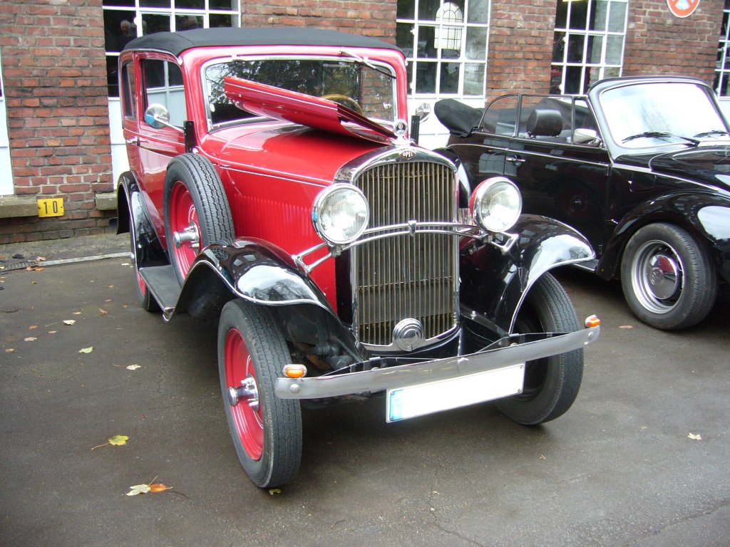 Opel 1.2 Liter (Serie B12). 1913 - 1935. Ein solcer1.2 Liter kostete im Jahr 1932, aus dem auch der abgelichtete Wagen stammt, RM 1.890,00. Dafür bekam man einen robusten Wagen mit 4-Zylinderreihenmotor, der aus 1.193 cm³ Hubraum 22 PS leistet. Oldtimertreffen Ennepetal am 04.11.2012.