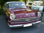 Opel Olympia Rekord P2 in der Karosserieversion Limousine viertürig, produziert von August 1960 bis Frühsommer 1963. Hier wurde eine viertürige Limousine aus dem Modelljahr 1961 in der Farbkombination koralle/alabastergrau abgelichtet. Der gezeigte Rekord ist ein 1700`er. Der stärkere 1.7l Motor mit 55 PS, kostete im Gegensatz zur Standardmotorisierung mit 1.5l und 50 PS einen Aufpreis von DM 75,00. Bis zur Produktionseinstellung im Spätsommer 1963 verließen ca. 550.000 Autos dieses Typs das Rüsselsheimer Opel-Werk. Beim ersten Zwischenstopp der Ausfahrt des Panoramatreffen der Alt-Opel IG am Luftschiffhangar des Flughafen Essen/Mülheim am 10.08.2024.