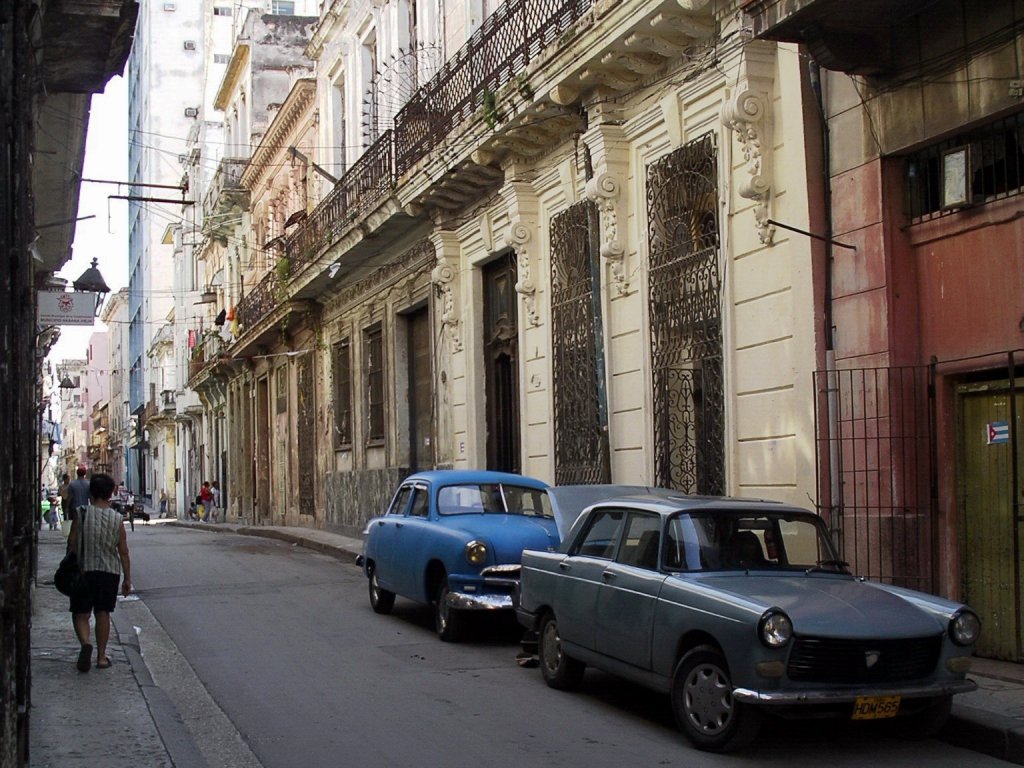 Peugeot 404 (aus argentinischer Produktion) in der Altstadt von Havanna. Dahinter ein US-Wagen aus den frühen Fünfzigern.