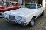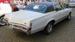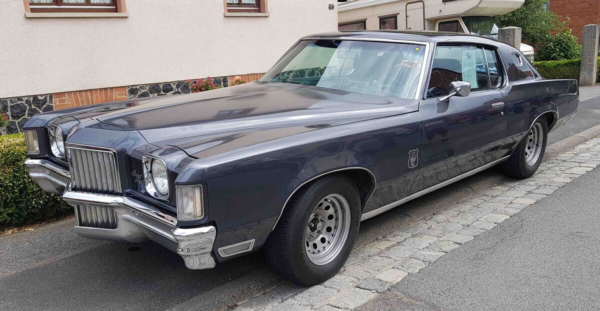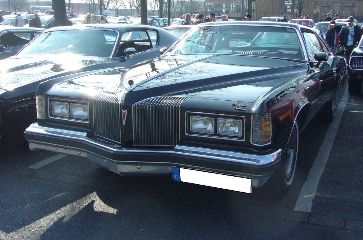 Pontiac Grand Prix aus dem Jahr 1976. Die Grand Prix Baureihe war bis Ende der 1980´er Jahre grundsätzlich nur als Coupe-Modell lieferbar. Im Modelljahr 1976 war der Kühlergrill, im so genannten "Waterfall-Design", besonders ausgeprägt dargestellt. Für einen solchen "Grand Prix" musste man in den Bundesstaaten der Ostküste und des Mittleren Westen mindestens US$ 4798,00 anlegen. In den Bundesstaaten der Westküste und den Südstaaten der USA waren es dann durch die höheren Frachtkosten schon mindestens US$ 5377,00. Der V8-Motor hat einen Hubraum von 350 cui (5735 cm³) und leistet 160 PS. Oldtimerbrunch am Cafe del sol in Gelsenkirchen am 09.03.2025.