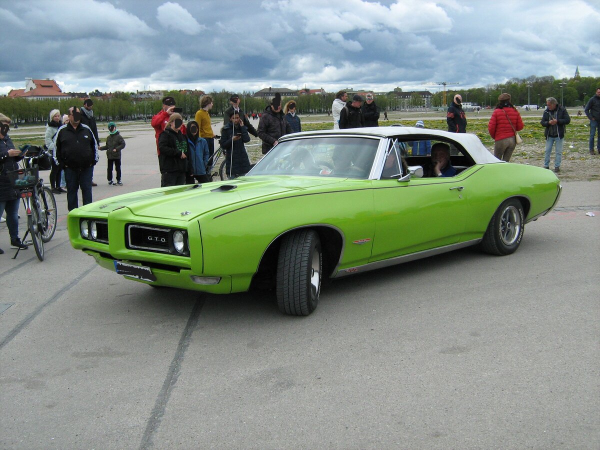 Pontiac GTO Convertible des Modelljahres 1966. Das Modell GTO war von 1964 bis 1974 eine eigenständige Modellreihe im Verkausprogramm der GM-Division Pontiac. Der Wagen war als Coupe oder Convertible (Cabriolet) lieferbar. Von diesem Cabrioletmodell verkaufte Pontiac im Jahr 1966 genau 12.798 Fahrzeuge zu einem Preis ab US$ 3425,00. Der V8-Motor hat einen Hubraum von 6361 cm³ und konnte wahlweise mit einem Doppelvergaser = 340 PS oder drei Doppelvergasern = 365 PS bestellt werden. Der abgelichtete GTO ist im Farbton fontaine blue lackiert. Classic Festival auf Schloss Lembeck im Juli 2019.