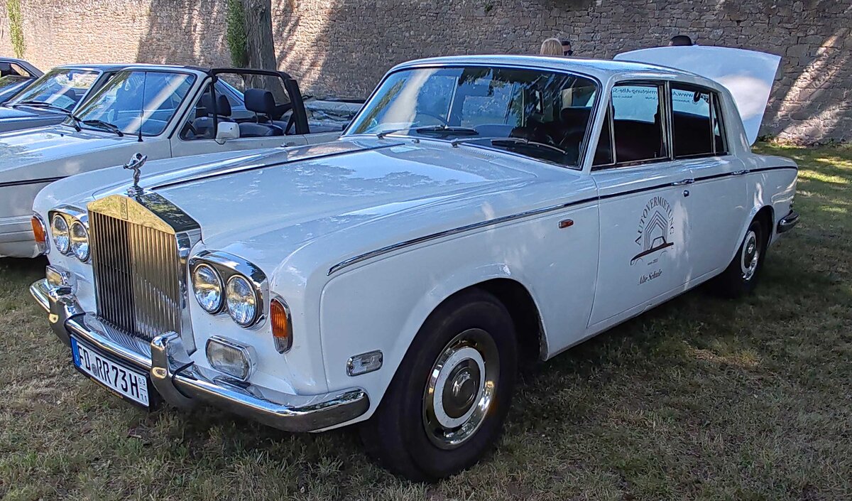 Rolls Royce Silver Shadow II, produziert von 1977 bis 1980. Als Silver Shadow wurde dieses Modell bereits im Jahr 1965 vorgestellt. Mit fast 29.000 verkauften Fahrzeugen in beiden Baureihen, war diese Baureihe bis in die 1980´er Jahre das meist verkaufte Modell der Edelmarke aus dem englischen Crewe (Grafschaft Cheshire). Der V8-Motor, dieser Limousine hat einen Hubraum von 6750 cm³ und leistet 201 PS. Der gezeigte Wagen, im Farbton cardinal red, wurde im Juli 1978 erstmalig in Kalifornien zugelassen. Dieses ist auch an den vorderen und hinteren, seitlichen, Begrenzungsleuchten zu erkennen. Laut dem heutigen Besitzer hat der Wagen damals einen Kaufpreis von 25.000,00 britischen Pfund, das entsprach damals ca. DM 120.000,00, gehabt. Oldtimertreffen auf dem Gelände des Bikertreffs Mutter Vogel in Marl am 28.09.2025. Michael H.