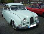Saab 96 aus dem Jahr 1963. Gebaut wurde der "96´er" von 1960 bis 1980. Der Saab 96 basierte auf dem ähnlich aussehenden Vorgängermodell Saab 93. Angetrieben wird dieses schwedische "Buckeltier" von einem Dreizylinderreihenzweitaktmotor mit Umkehrspülung, der aus einem Hubraum von 841 cm³ eine Leistung von 38 PS auf die angetriebenen Vorderräder überträgt. Die Höchstgeschwindigkeit liegt bei 125 km/h. Oldtimertreffen am Theater an der Niebu(h)rg am 19.10.2025 in Oberhausen/Rheinland. Michael H.