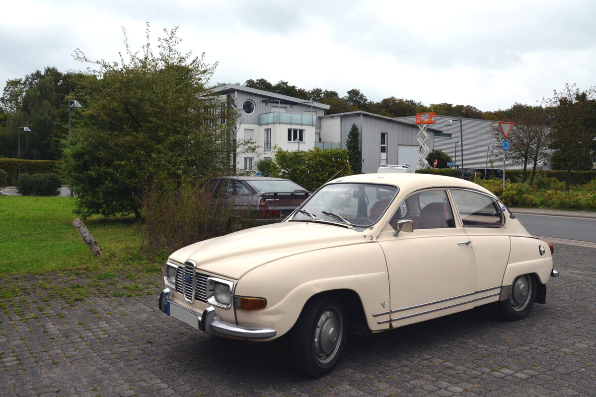 Saab 96 aus dem Jahr 1963. Gebaut wurde der  96´er  von 1960 bis 1980. Der Saab 96 basierte auf dem ähnlich aussehenden Vorgängermodell Saab 93. Angetrieben wird dieses schwedische  Buckeltier  von einem Dreizylinderreihenzweitaktmotor mit Umkehrspülung, der aus einem Hubraum von 841 cm³ eine Leistung von 38 PS auf die angetriebenen Vorderräder überträgt. Die Höchstgeschwindigkeit liegt bei 125 km/h. Oldtimertreffen am Theater an der Niebu(h)rg am 19.10.2025 in Oberhausen/Rheinland.