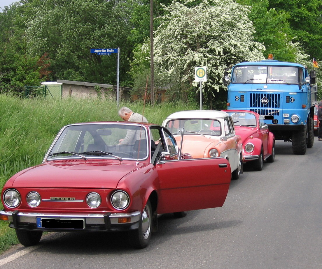 Am 28.04.2024 unternahmen bei schönstem Frühlingswetter auch einige Veteranen auch in Tschechien einen Sonntags Ausflug. Hier überquert ein Skoda 110 R Coupe gerade den Bahnübergang am Haltepunkt Hostec der Bahnstrecke Marienbad - Karlsbad. In kleinem Abstand folgt eine Borgward Isabella. Gerd Hahn