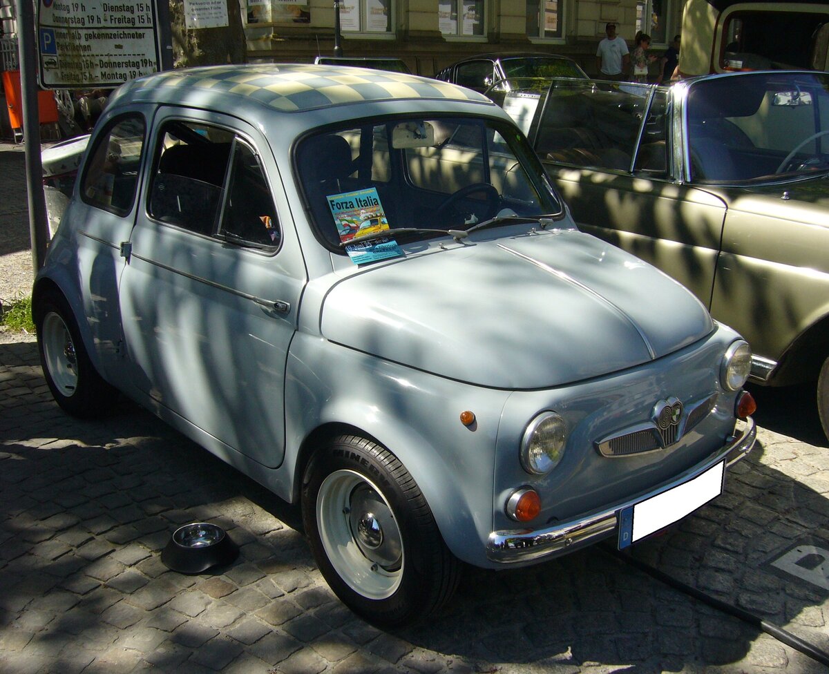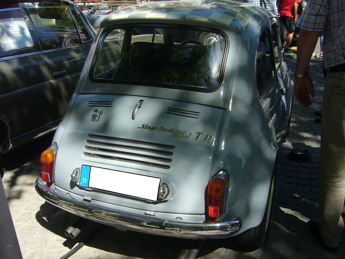Steyr Puch 650 TR 1, gebaut von 1964 bis 1969. Die "Rennsemmel" aus Graz-Thondorf wurde vielfach im Bergrenn- und Rundstreckensport eingesetzt. Der Zweizylinderboxermotor mit einem Hubraum von 643 cm³ leistet laut Werk bis zu 30 PS. Durch verschiedene Modifizierungen war jedoch wesentlich mehr Leistung möglich. Er stellte die Fahrleistungen des Cinquecento, von dem der Steyr Puch abgeleitet wurde, bei weitem in den Schatten. Kleinwagentreffen an Mo´s Bikertreff in Krefeld am 20.06.2019.