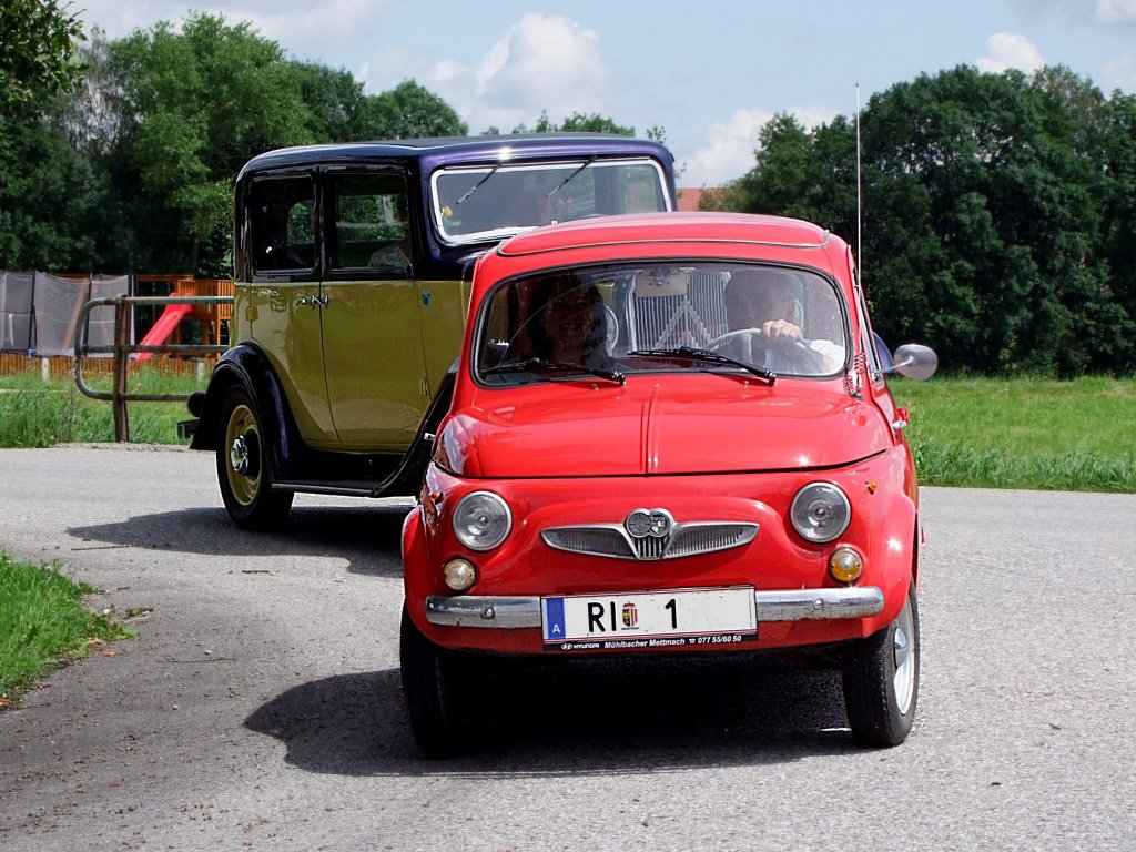 Steyr Puch 650 TR 1, gebaut von 1964 bis 1969. Die "Rennsemmel" aus dem österreichischen Graz-Thondorf wurde vielfach im Bergrenn- und Rundstreckensport eingesetzt. Der Zweizylinderboxermotor mit einem Hubraum von 643 cm³ leistet laut Werksangabe bis zu 30 PS. Durch verschiedene Modifizierungen war jedoch wesentlich mehr Leistung möglich. Er stellte die Fahrleistungen des Fiat 500 (Cinquecento), von dem der Steyr Puch abgeleitet wurde, bei weitem in den Schatten. 17. Oldtimertreffen in der Altstadt von Essen-Kettwig am 01.05.2025. Michael H.