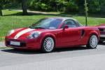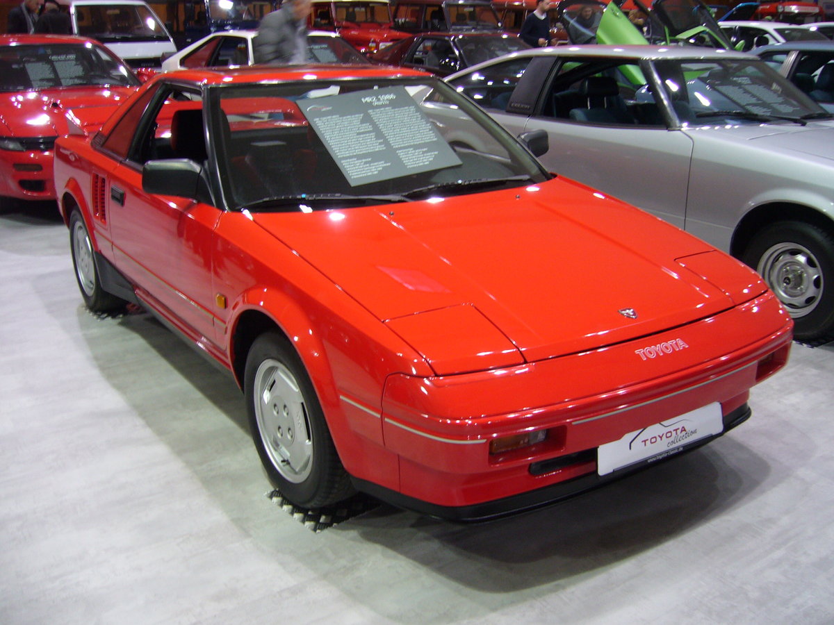 Toyota MR2. Das Modell MR2 wurde von 1985 bis 2007 in drei Baureihen produziert. Hier sehen wir ein frühes Modell (Baureihe AW11) der ersten Serie. Der Wagen wurde 1986 produziert. Der als Mittelmotor verbaute 4-Zylinderreihenmotor war in folgenden Leistungsstufen bestellbar: 1453 cm³ Hubraum mit 83 PS und einer Höchstgeschwindigkeit von ca. 180 km/h oder 1587 cm³ Hubraum mit 130 PS und einer Höchstgeschwindigkeit von 200 km/h. Toyota Collection Köln am 02.12.2017.