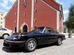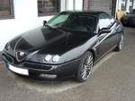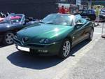 Ein rechts gelenkter Alfa Romeo Tipo 916 Spider, wie er von 1994 bis 2005 im Verkaufsprogramm von Alfa Romeo zu finden war. Der Tipo 916 wurde auf dem Pariser Salon 1994, parallel mit seinem Schwestermodell Tipo 916 GTV Coupe, vorgestellt. Das Design stammt von Pininfarina. Die meisten Käufer wählten den völlig neu konstruierten Vierzylinderreihenmotor mit zwei oben liegenden Nockenwellen. seine Arbeit. Der Motor leistete anfänglich 150 PS aus einem Hubraum von 1970 cm³. Ab dem Modelljahr 1998 erhöhte sich die PS-Leistung auf 155 PS. Eine Besonderheit dieses Modelles war, das die Motorhaube aus Kunststoff gefertigt wurde. Classic car meeting in Brynmawr/South Wales am 27.07.2025. Michael H.