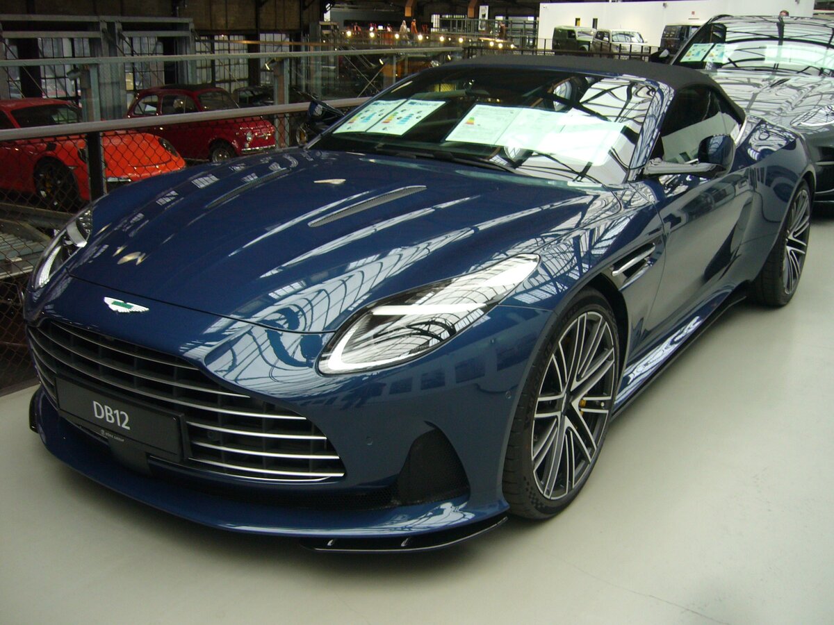 Aston Martin DB12 Roadster im Farbton seychelles blue. Im Mai des letzten Jahres wurde der DB12 (Coupeversion) als Nachfolger des seit 2016 gebauten DB11 vorgestellt. Im August schob die Marke aus Gaydon/Warwickshire den DB12 in einer Cabrioletversion nach. Für recht zügigen Vortrieb sorgt ein V8-Motor aus dem Hause AMG. Dieser V8-Motor hat einen Hubraum von 3982 cm³ und leistet, mittels zweier Turbolader, 680 PS. Die Höchstgeschwindigkeit wird mit 325 km/h angegeben. Classic Remise Düsseldorf am 01.11.2024.