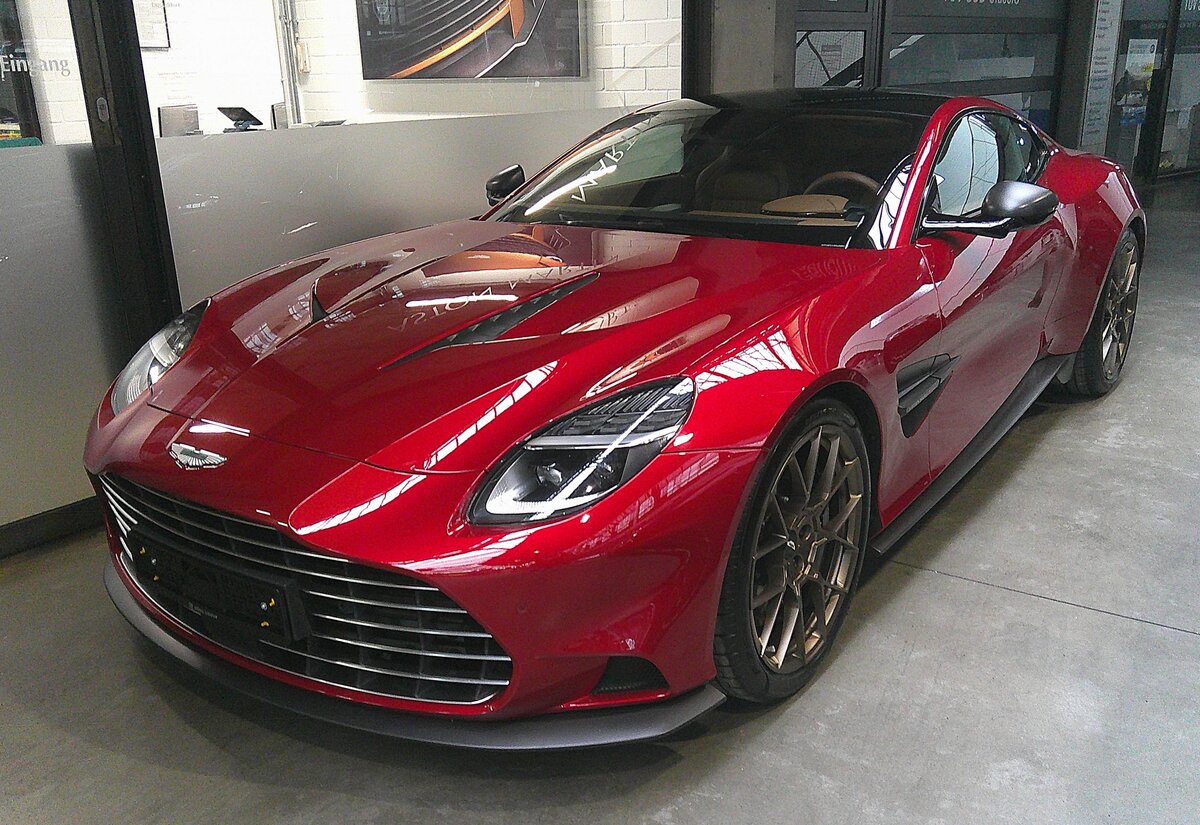 Heckansicht eines Aston Martin Vanquish Coupe im Farbton liquid crimson. Classic Remise Düsseldorf am 15.01.2026.