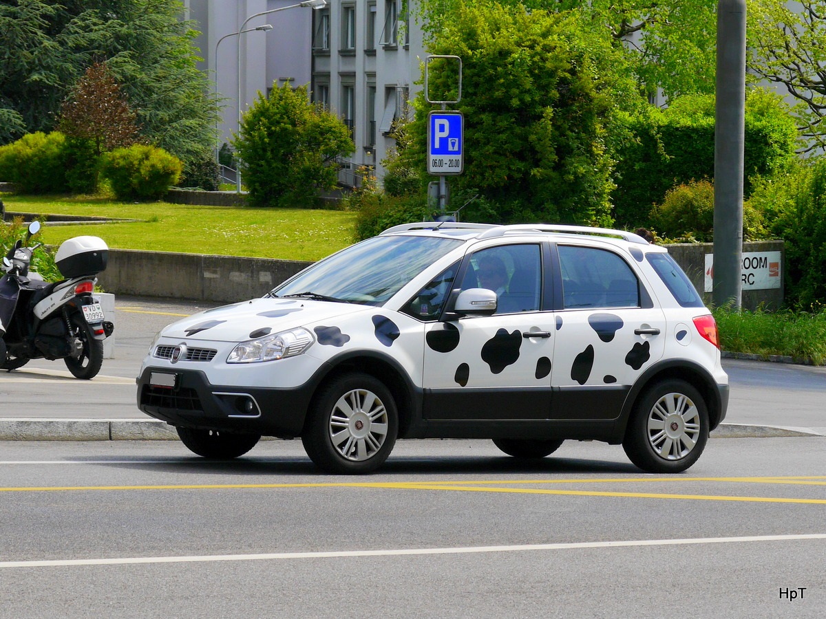 Weisser Fiat mit Schwarzen Flecken unterwegs in der Stadt Lausanne am 10.05.2016