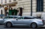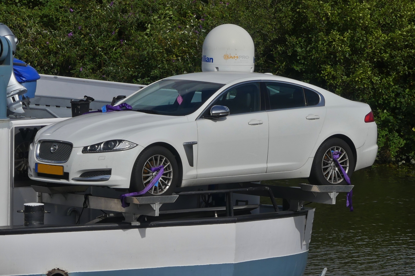 Jaguar XJ, steht hinten auf einem Aufbau eines Güterschiffes. 09.2024
