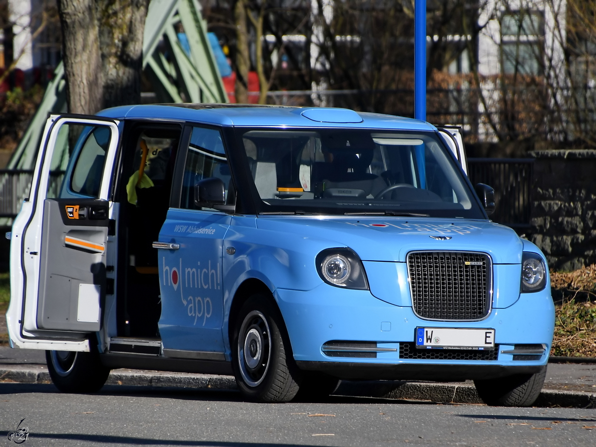 Eines der insgesamt sechs LEVC TX Shuttle der WSW Wuppertaler Stadtwerke GmbH war Mitte Februar 2021 in Wuppertal mit geöffneten Fondtüren zu sehen.