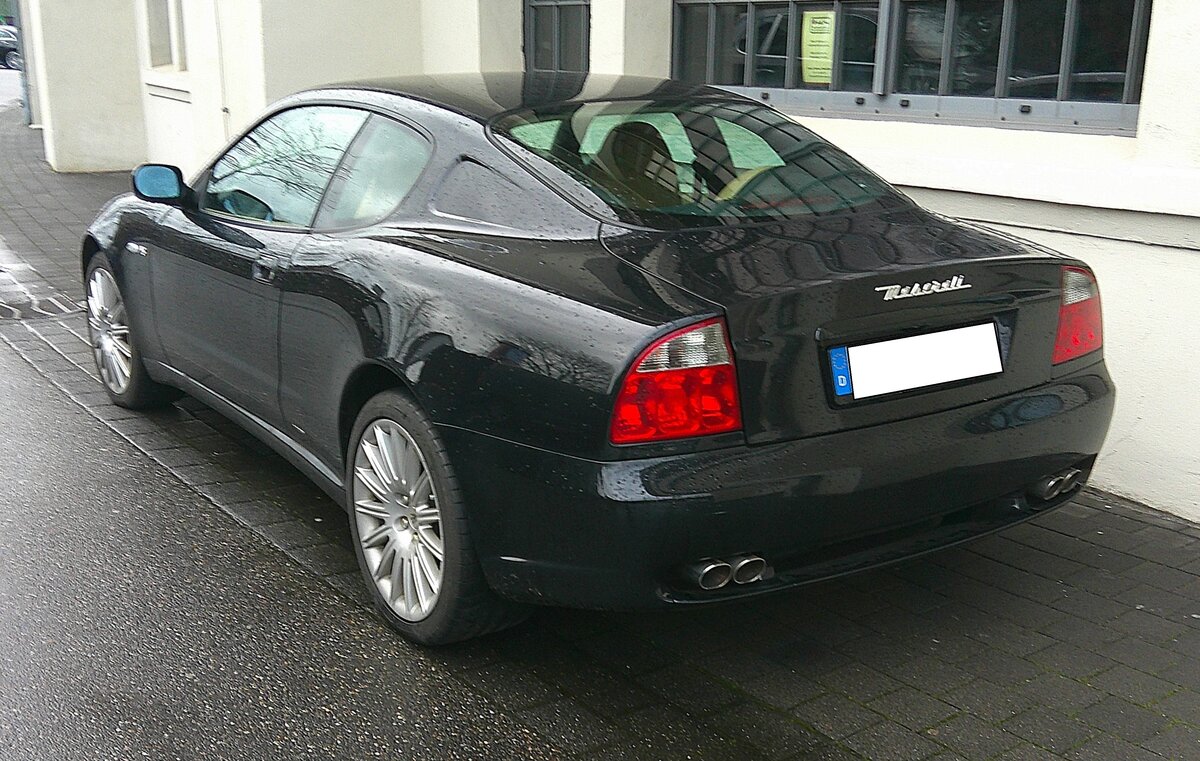 Maserati 4200 GT Coupe. Vorgestellt wurde das Modell auf der IAA des Jahres 2001. Ein Jahr später folgte auf der Detroit Motor Show die Präsentation des Cabriolets der gleichen Baureihe. Bis zum Jahr 2007 wurden beide Modelle dann parallel gebaut. Das gezeigte Coupe dürfte im Farbton carbon nero lackiert sein. Für Vortrieb sorgt ein V8-Motor mit einem Hubraum von 4244 cm³ und einer Leistung von 390 PS. Die Höchstgeschwindigkeit gab das Werk mit 285 km/h an. Besucherparkplatz der Düsseldorfer Classic Remise im Januar 2025.