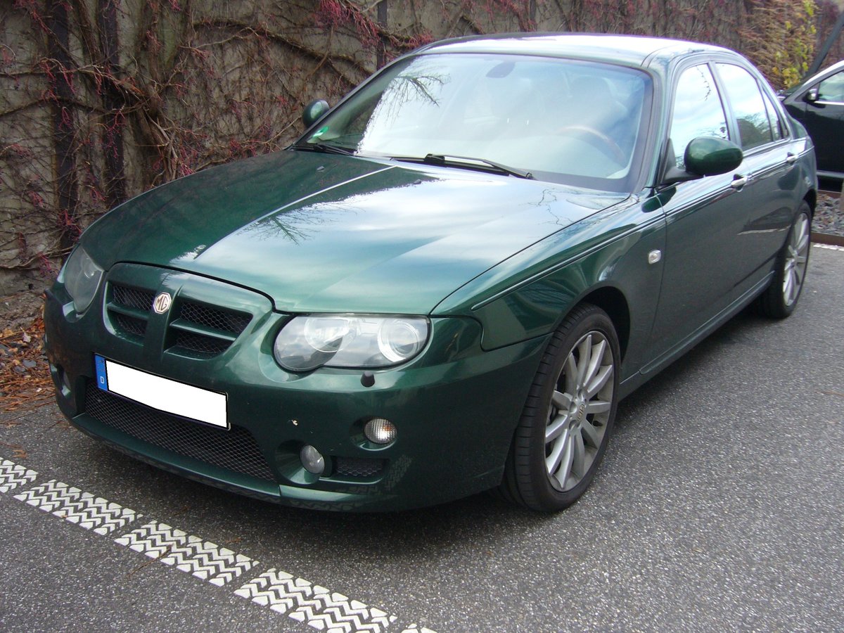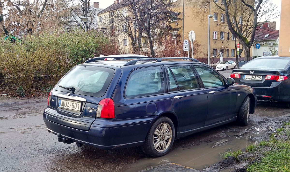 MG ZT, produziert von 2001 bis 2005 mit der Insolvenz der Firma. Der ZT ist die sportliche Variante des bereits 1998 vorgestellten Rover 75 und war als viertürige Limousine und als fünftüriges Kombimodell ZT-T (das T steht für Touring) lieferbar. Dieses Modell war in etlichen Motorisierungsvarianten lieferbar. Dieser MG hat einen V6-Motor mit einem Hubraum von 2497 cm³ und einer Leistung von 190 PS. Besucherparkplatz der Düsseldorfer Classic Remise am 26.11.2020.