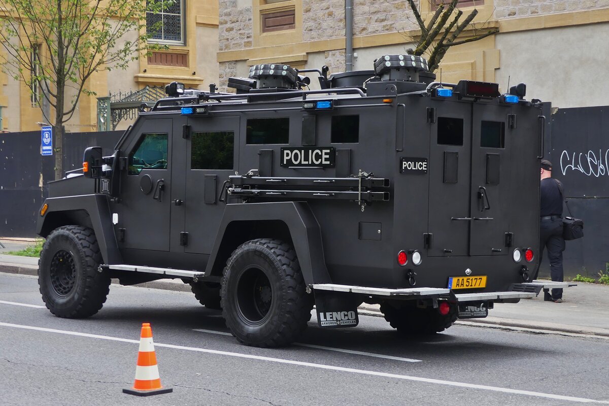 Lenco BearCat, Gepanzertes Fahrzeug der luxemburgischen Polizei, steht in der Kolonne der Fahrzeuge zur Militärparade in der Stadt Luxemburg bereit. 23.06.2024