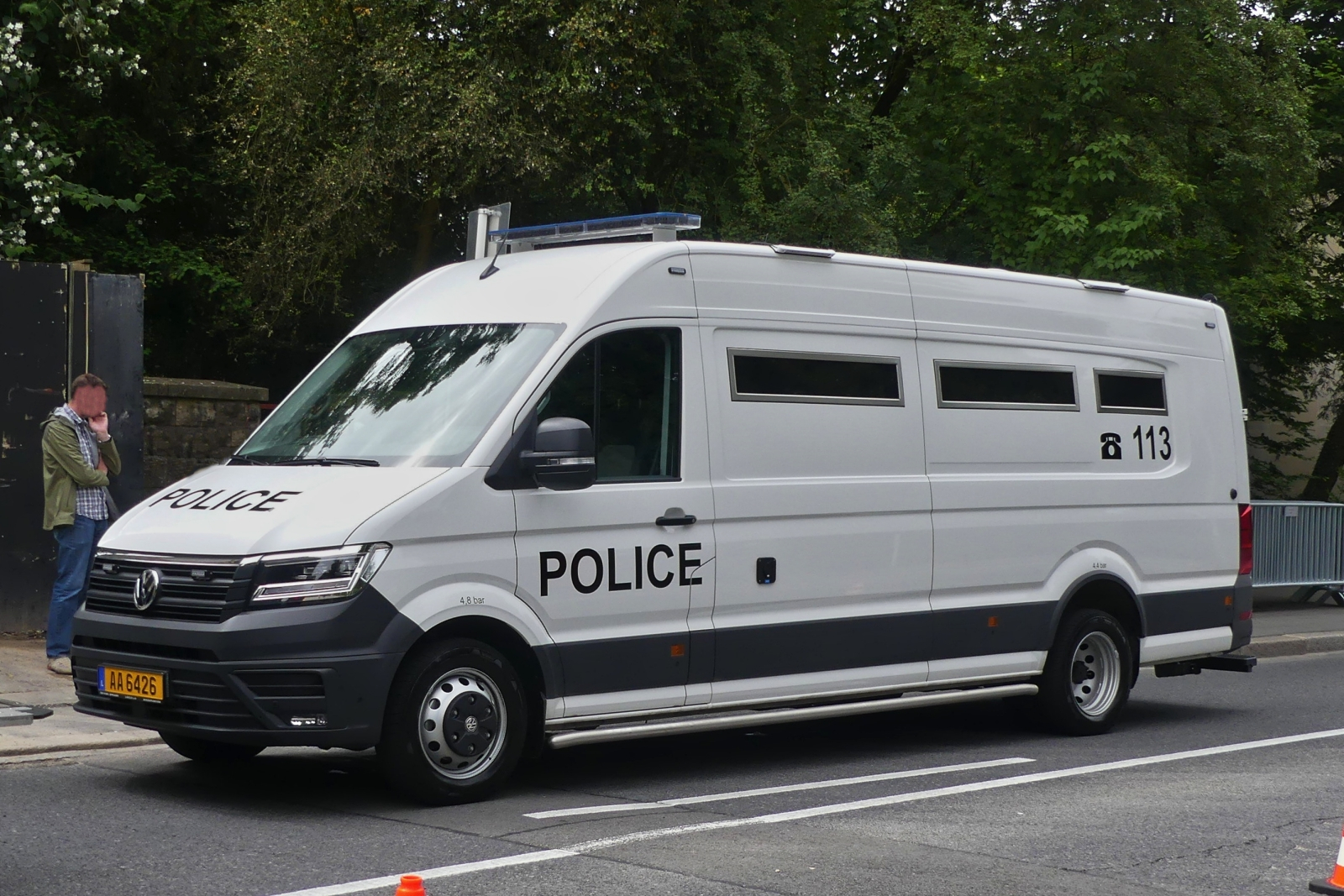 VW Crafter II, Gefangenen Transporter, der luxemburgischen Polizei, steht in der Kolonne der Fahrzeuge zur Militärparade in der Stadt Luxemburg bereit. 23.06.2024