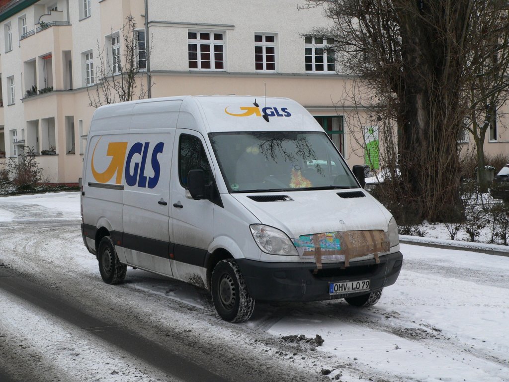 GLS-Paketfahrzeug, gegen die starke Kälte im Februar 2012 abgesichert. Nicht schön, aber sicher praktisch. Berlin Stolzenfelsstraße, 9.2.2012