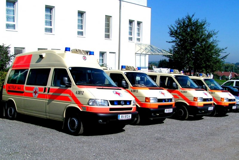 RotKreuz Einsatzfahrzeuge stehen anlässlich des Tages d. offenen Tür des RK RIED i.I. nebeneinander; 070923
