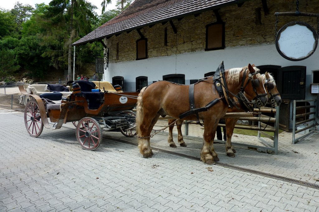 Zweispänner Pferdekutsche wartet auf Gäste, Juli 2012