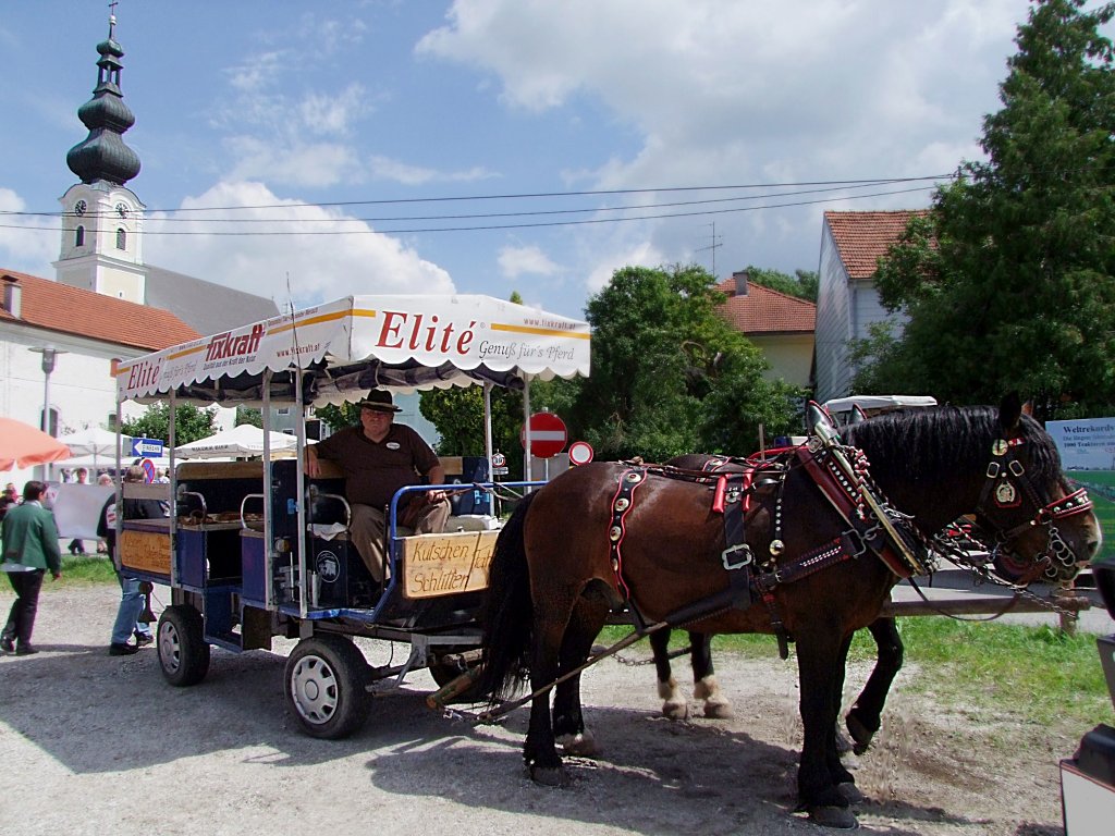 Scharrend warten die beiden Pferde mit ihrer Kutsche in Waldzell auf Kundschaft;100725