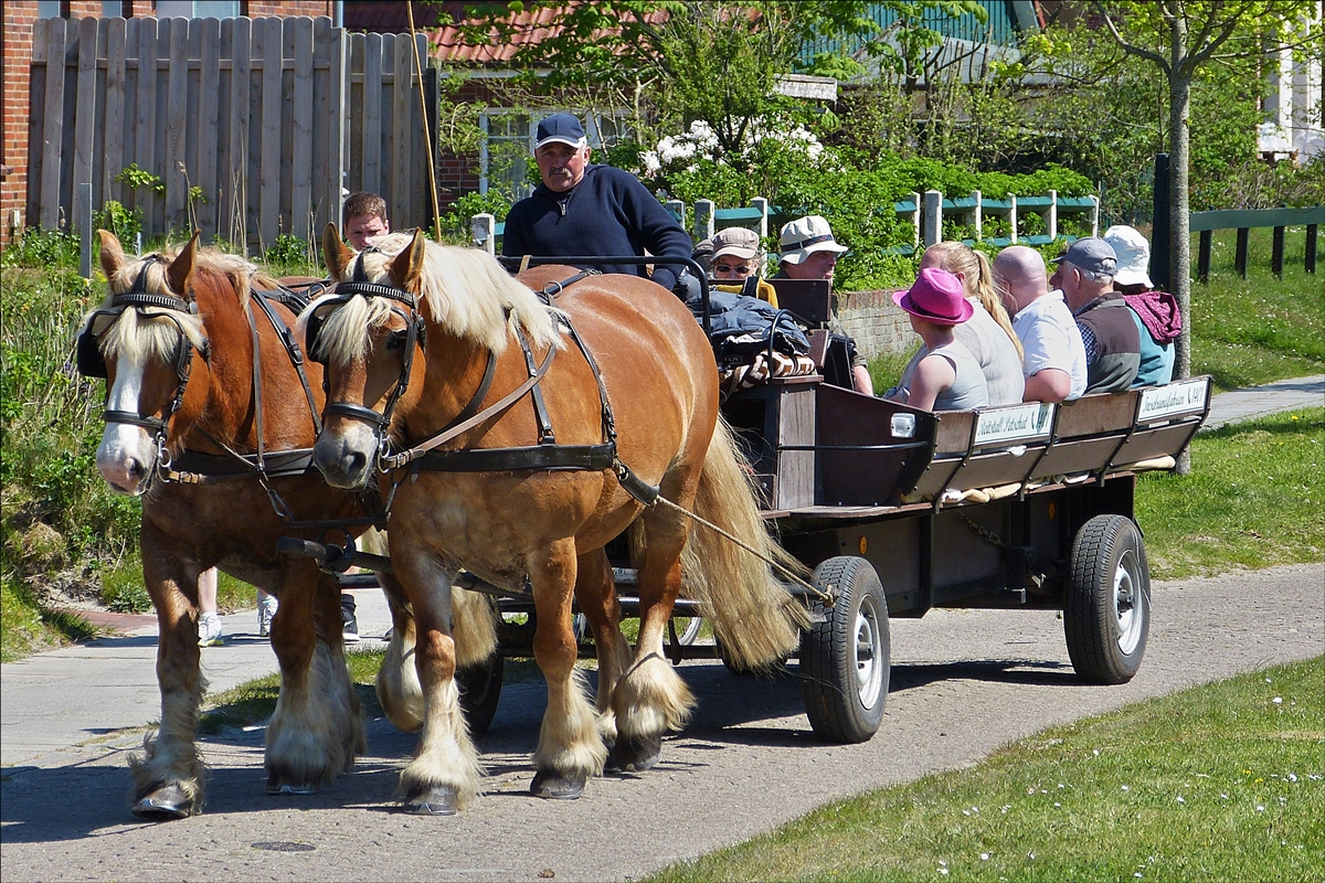 . Bei der Inselrundfahrt auf der Insel Spiekeroog geht es mit diesem Pferdegespann gemächlich zu. 07.05.2016