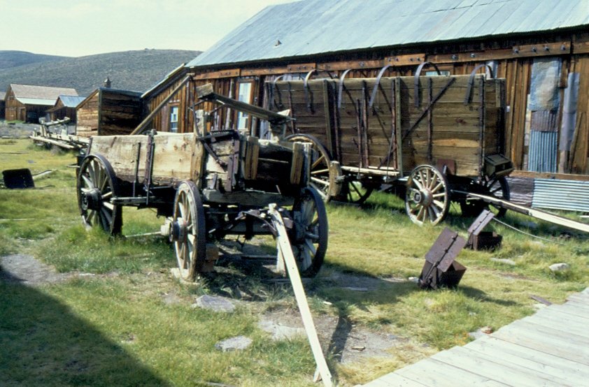 In Bodie, einer "Geisterstadt" in Kalifornien stehen seit vielen Jahren diese beiden verlassenen Wagen. (Juli 1992)