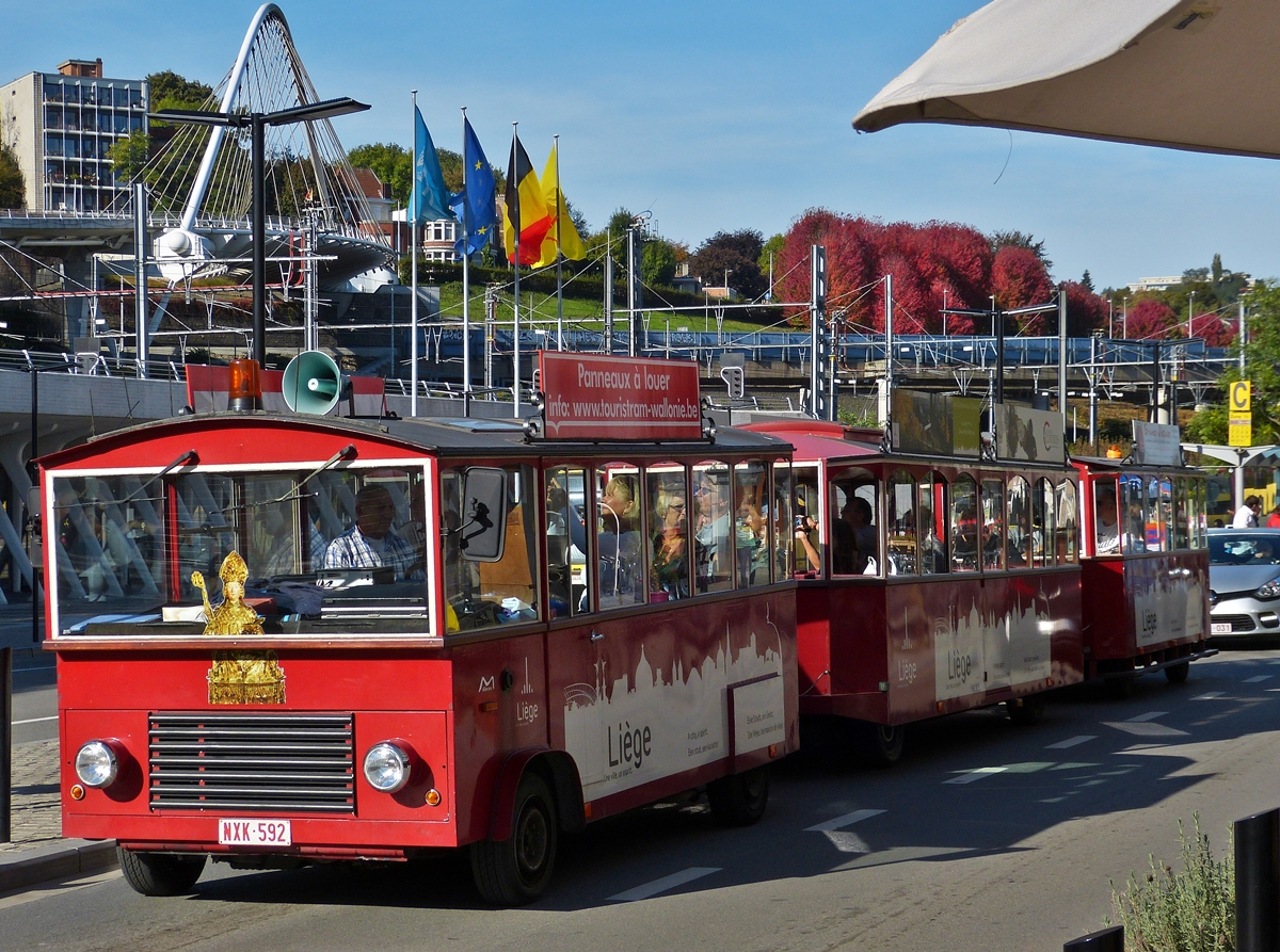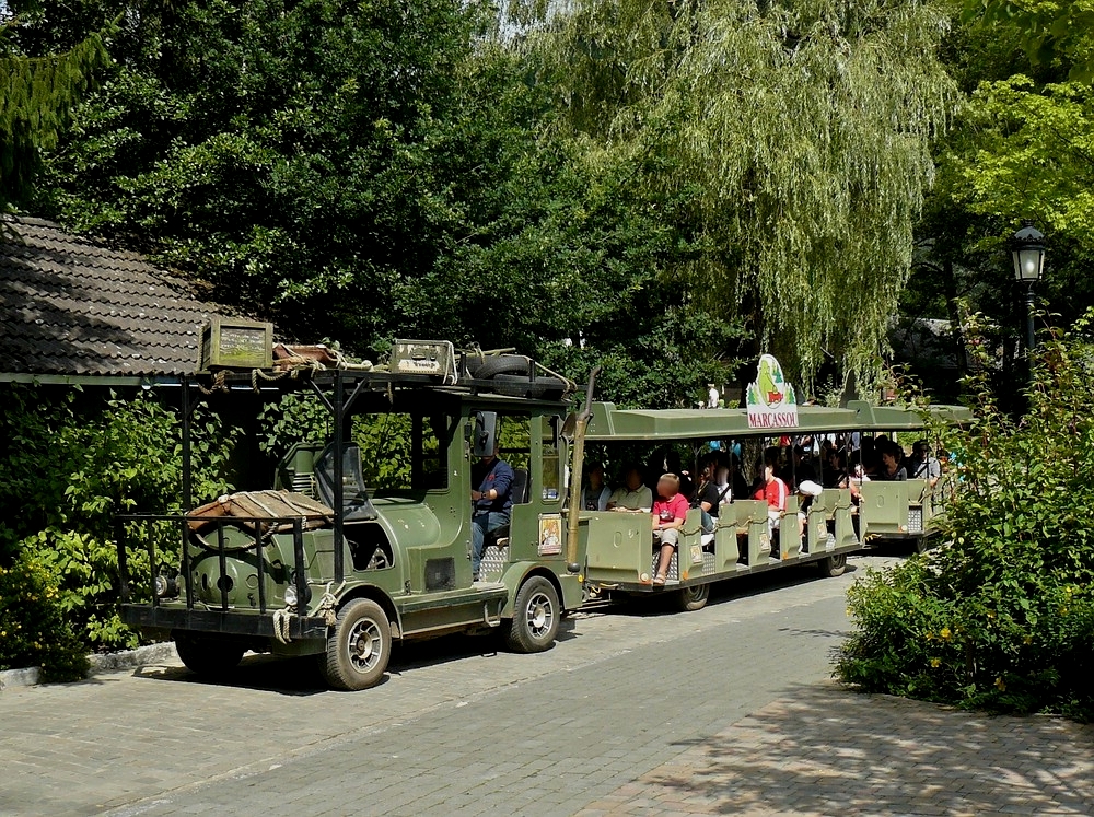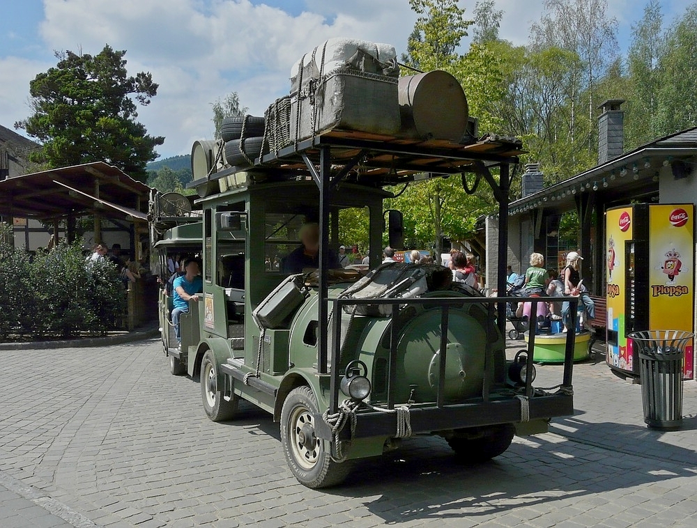 Im Safari-Look ausgestattete Straßen-Eisenbahn im Freizeitpark in Coo(B), bei der Abfahrt zu einer 40 minütigen Rundreise durch das angrenzende Wildgehege, in welchen unter anderem Wildschweine, Rothirsche, Mufflons vom Wagen aus gefüttert werden können. 03.08.2010 De Rond Hans und Jeanny