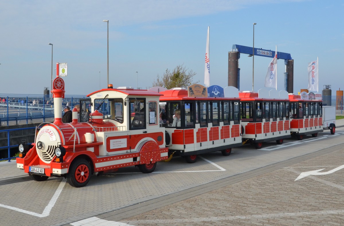 Die Cuxlibahn am Hafen von Cuxhaven für Stadtrundfahrten bereit am 03.10.15.