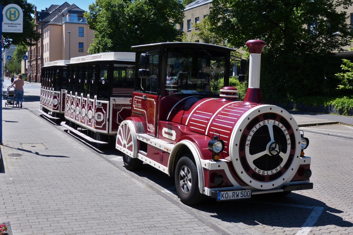 Straßeneisenbahn Altstadt Express Koblenz an der Start Haltestelle vor der Kastor Kirche. 06.2022