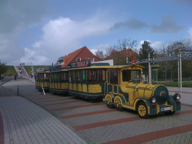 Der "Nordsee Express", eine Straßeneisenbahn, ist in den Straßen Norden-Norddeichs Unterwegs. Zu der Rundfahrt kann man an 11 Haltestellen einsteigen. Aufgenommen am 08.Oktober am Deich in Norden-Norddeich.