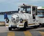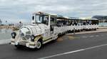 Ein Straßen Eisenbahn aus Hartpappe war zum Wochenende der Mobilität am Rande eines Parkplatzes in Annecy aufgebaut worden, an der unsichtbaren Seite wurde schon Farbe aufgetragen. 09.2022