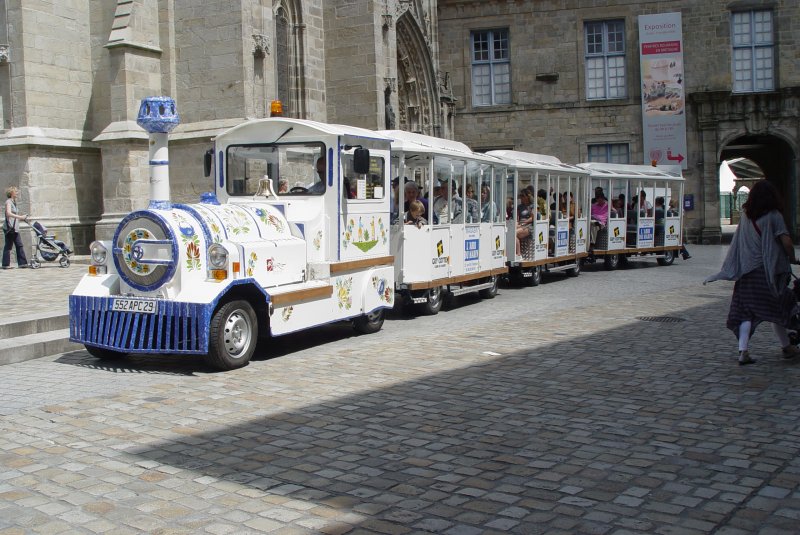 Diese Strassen-Eisenbahn hielt am 23.07.2009 neben der Kathedrale von Quimper in der Bretagne. Die Zugmaschine ist dekoriert mit Mustern von Faiencen. Diese Industrie ist in Quimper angesiedelt.