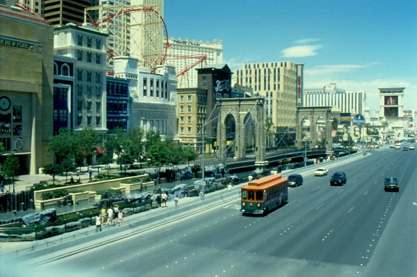 1998 ist dieser Trolley in Las Vegas auf dem Strip unterwegs auf einer Stadtrundfahrt (einem San Francisco Cable Car nachgebildet). digitalisiertes Dia